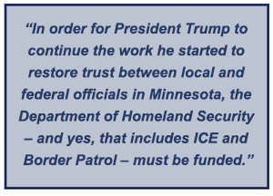 “In order for President Trump to continue the work he started to restore trust between local and federal officials in Minnesota, the Department of Homeland Security – and yes, that includes ICE and Border Patrol – must be funded.”