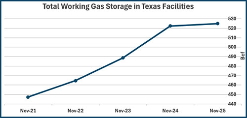 To further strengthen preparedness, CID recently hosted a tabletop exercise with operators. The session provided guidance on inspection readiness, emergency management practices and weather‑related resources to ensure operators have the tools and knowledge needed as Texas heads into the winter months.Additionally, underground natural gas storage provides a critical reserve that can be drawn upon during severe weather emergencies. As of November 30, 2025, the RRC reported approximately 524.9 billion cubic feet of working gas in storage, which is the highest monthly total recorded in more than 25 years of tracking volumes.