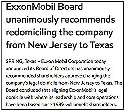 So it's not a great surprise that Exxon, which was founded as Standard Oil of New Jersey in 1882, has moved to the Lone Star State and is now legally domiciling there.The Exxon board of directors' letter explaining WHY they are moving from blue New Jersey to red Texas should be a wake up call to every blue state chamber of commerce across the nation: