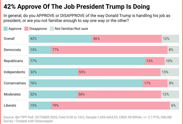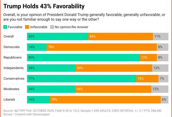 WASHINGTON, D.C. (Texas Insider Report) — Despite nonstop media efforts trying to create controversy or question his administration – not to mention the controvery surrounding Democrat's #SchumerShutdown, September’s news-filled month that included the assassination of Charlie Kirk, the ongoing Russia-Ukraine war, and the now-successful effors to end the Israel-Hamas conflict – President Donald Trump’s "favorability" and "approval" ratings remained rock solid in early October, says the latest I&I/TIPP Poll.