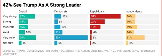 On the other end, 38% described Trump’s leadership as “weak” (10%) or “very weak” (28%), a single percentage-point decline from last month. Only 4% said they weren’t sure in October.