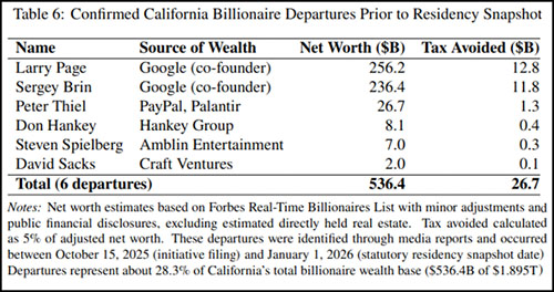 A new study by economists at the Hoover Institute finds that at least six billionaires left the Golden State before the start of the year to avoid the proposed California Billionaire Tax Act. This is a ballot initiative to be voted on later this year that would create a 5% wealth tax on billionaires who have lived in California at any time after January 1, 2026. Proponents expect a $100 billion windfall to the California treasury.